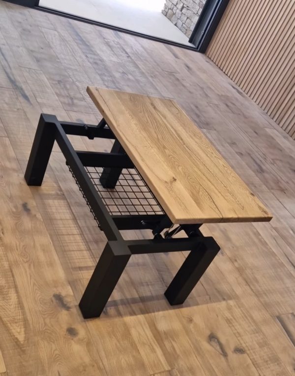 Ce modèle de table basse sur mesure est sacrément pratique. Son plateau relevable sur vérin avec frein permet de ranger bouquins, télécommandes et tous les petits encombrants que l’on ne veut pas forcement voir chez soi. Un meuble tout-en-un, non seulement pratique, mais offrant aussi un vrai gain de place.