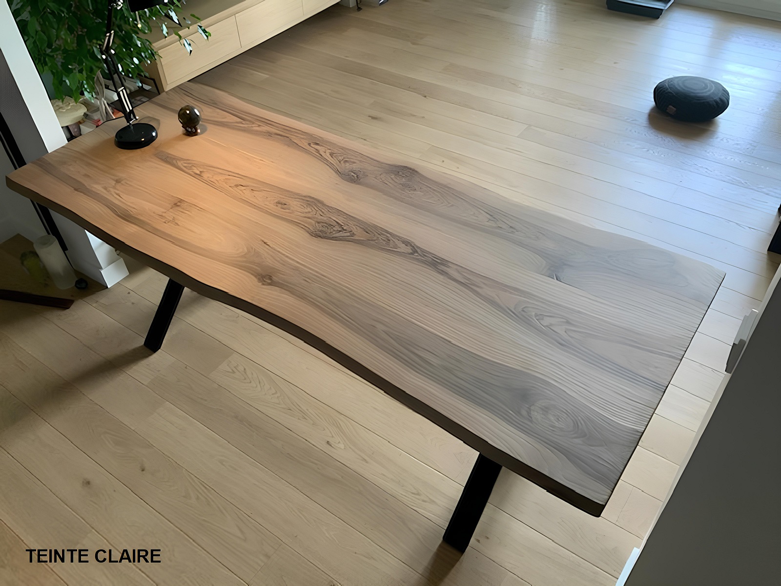 Concernant la protection, notre choix s’est porté sur un vernis polyuréthane très haute performance. Ce dernier offre le meilleur rendu pour le noyer. Au delà de le mettre en valeur, votre table sera résistante aux produits chimiques courants comme les produits de nettoyage, les taches de graisse, de café ou de vin.